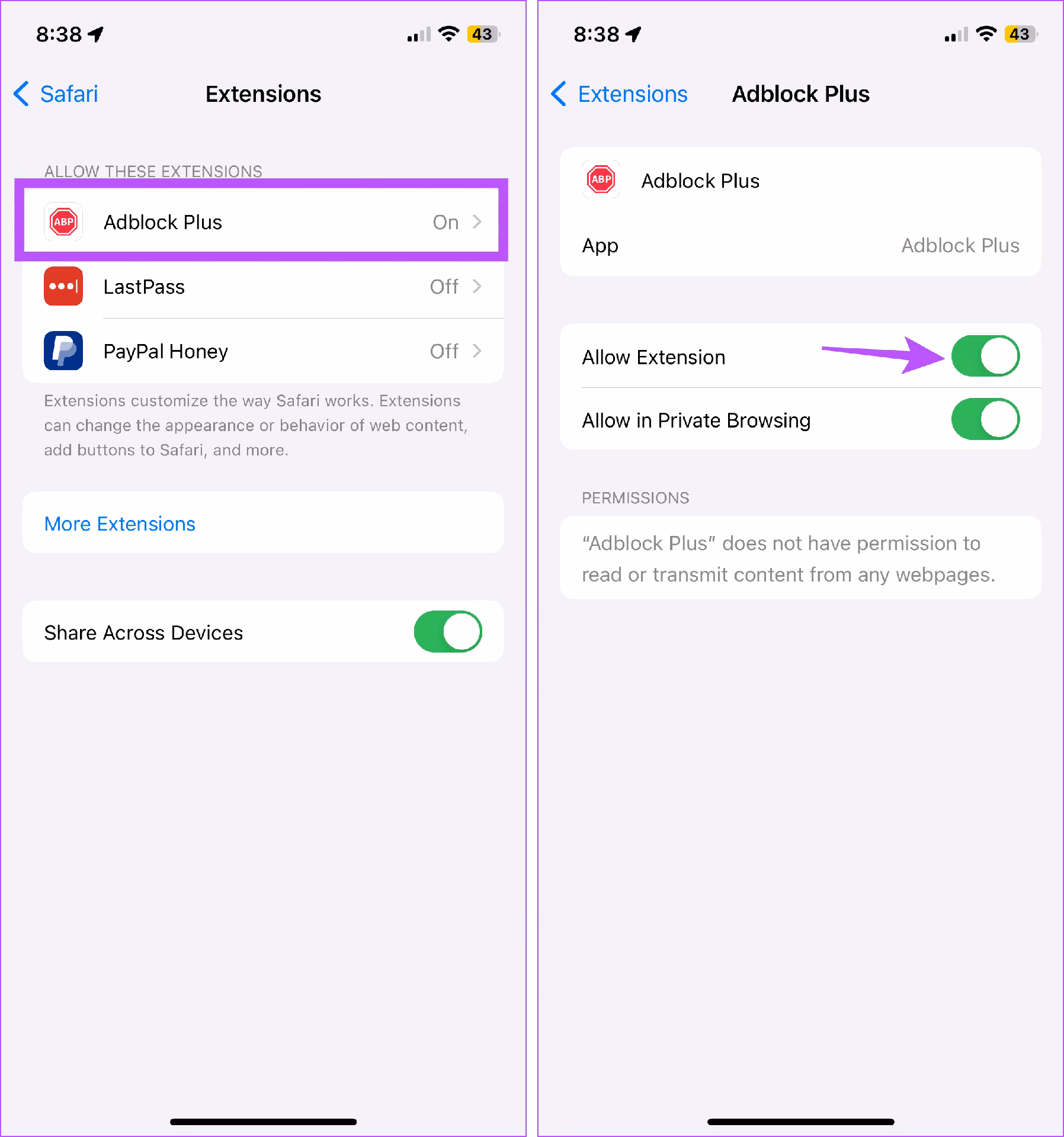 Hvis du har installeret tredjeparts adblocker-udvidelser i Safari på din Mac, skal de deaktiveres separat: