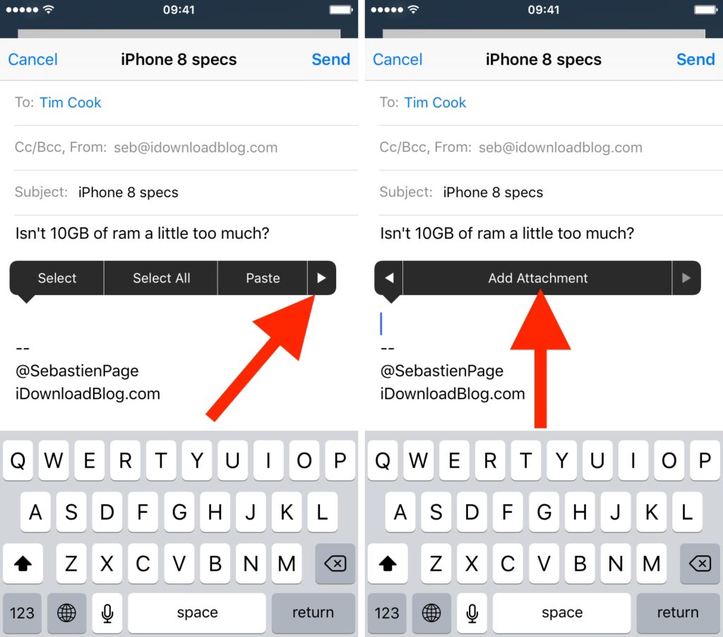 - Tilføj en vedhæftning: Tryk og hold et sted inde i e-mailens brødtekst. Fra den menu, der dukker op, skal du vælge 'Tilføj vedhæftning'.