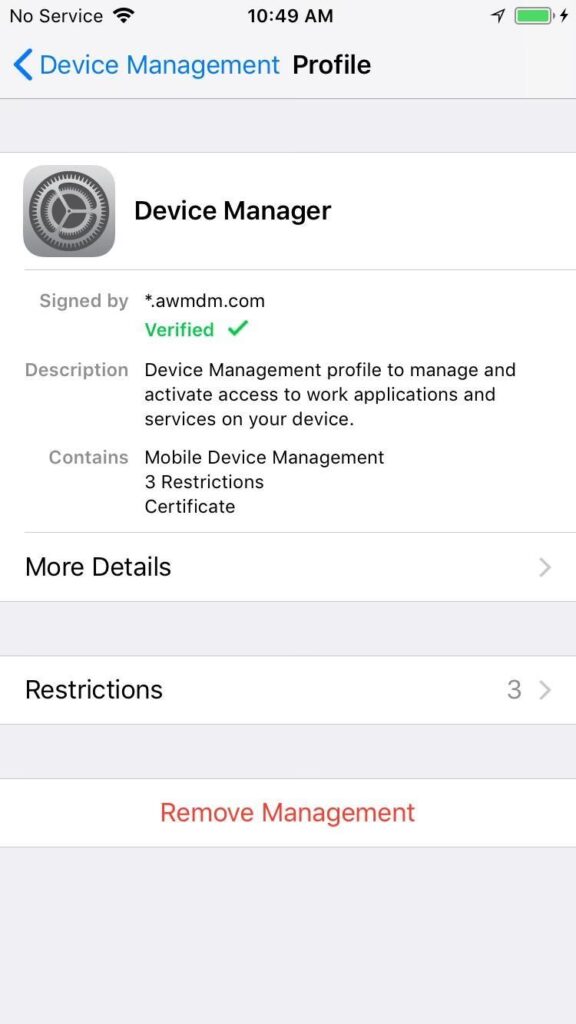 Denne indstilling er ofte gråtonet, hvis administratoren har indstillet MDM-profilen som ikke-fjernbar fra slutenheden. Dette sker typisk på virksomhedsejede eller "supervised" (overvågede) enheder, hvor virksomheden ønsker at opretholde fuld kontrol over enheden og forhindre brugere i at fjerne administrationen på egen hånd.