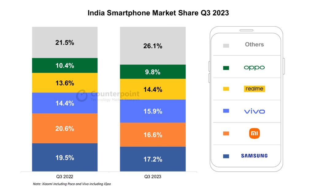 Samsung fortsætter med at drage fordel af sine lokale produktionsanlæg i Noida og Tamil Nadu. Dette forbedrer forsyningskædekontrol og prissætning. Deres Galaxy M og A-serie adresserer mellemklassen, mens S-serien opretholder stabilitet i premium-segmentet. Softwarepålidelighed og et bredt detailnetværk bidrager til Samsungs konstante brand-appel.