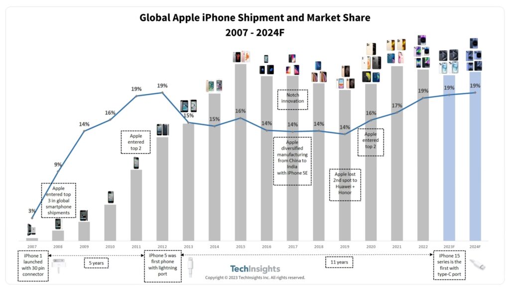 Mens Samsung fastholdt føringen i 3. kvartal 2024, skete der en historisk omvæltning, da man ser på hele kalenderåret 2023. For første gang nogensinde lykkedes det Apple at overhale Samsung – og alle andre smartphoneproducenter – til at indtage førstepladsen i globale smartphoneforsendelser. Dette er en banebrydende bedrift, der markerer et skifte i det globale magtforhold på smartphonemarkedet.