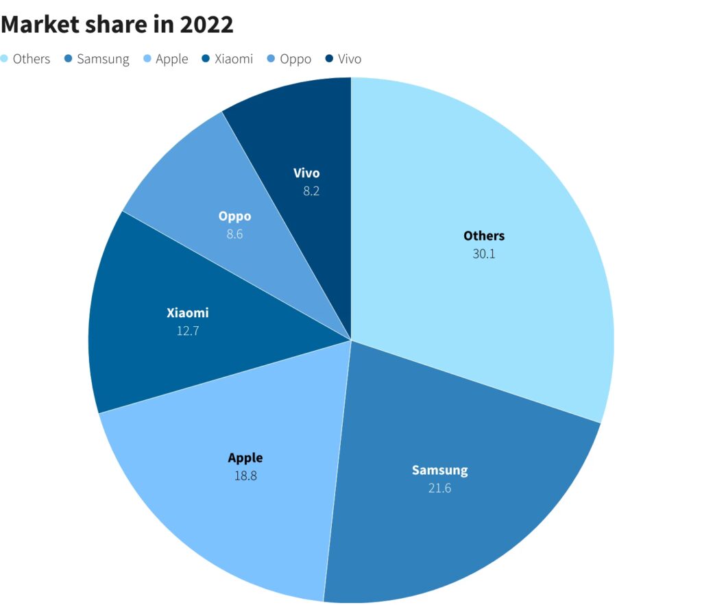For at give et klarere billede af markedets landskab i 2023, her er en sammenlignende oversigt over de største smartphoneproducenters markedsandele: