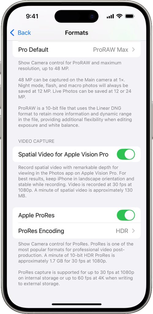 ProRAW blev introduceret med iPhone 12 Pro og 12 Pro Max og er tilgængelig på alle Pro-modeller siden da. ProRes blev introduceret med iPhone 13 Pro og 13 Pro Max og er tilgængelig på alle Pro-modeller siden da. Dog understøtter iPhone 14 Pro og Pro Max som de første 48MP ProRAW og 4K ProRes ved 30 FPS på modeller med tilstrækkelig lagerplads.