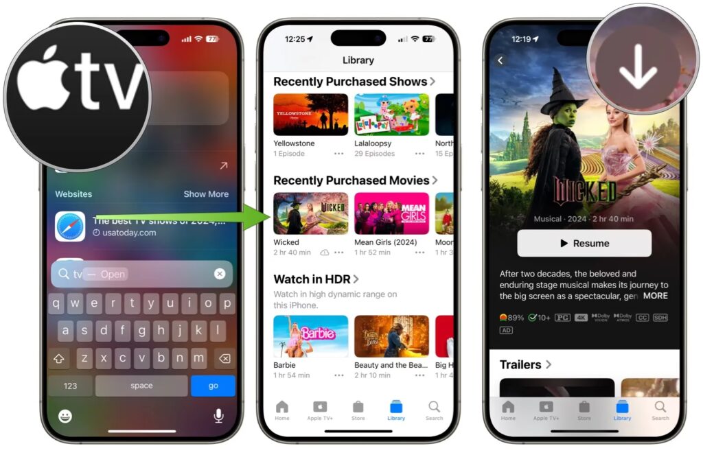 Learn how to download or stream content from Apple TV+, MLS Season Pass, and Apple TV channels. Open the Apple TV app on your iPhone, iPad, Mac, or PC. Browse or search for a TV show, movie, or event. Choose the show, movie, or event, then choose the Download button on your iPhone, iPad, or Mac. Click the Download button on your PC.