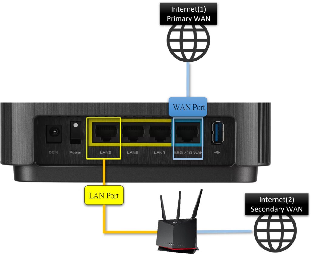 - Tilslut begge WAN-forbindelser: Sørg for, at din primære internetforbindelse er tilsluttet routerens primære WAN-port, og at din backup-forbindelse (f.eks. din iPhone via USB eller en anden internetkilde) er forbundet til den relevante port eller USB-port på routeren.