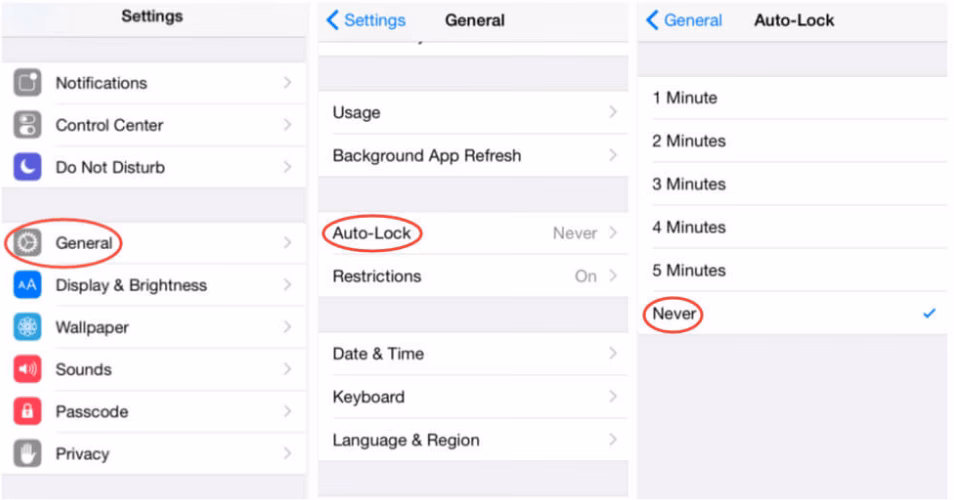 Nu hvor du er i indstillingerne for Automatisk Lås, skal du blot vælge 'Aldrig'. Ved at vælge denne mulighed instruerer du din iPhone om at holde skærmen tændt på ubestemt tid, eller indtil du aktivt låser den ved at trykke på sideknappen (eller topknappen på ældre modeller). En bekræftelse vil vise sig i form af et flueben ved siden af 'Aldrig'. Når dette er gjort, kan du trygt forlade Indstillinger-appen. Din iPhone-skærm vil nu forblive aktiv, hvilket giver dig en uafbrudt oplevelse, uanset om du læser, følger opskrifter eller bruger din telefon som en skærm under arbejde.
