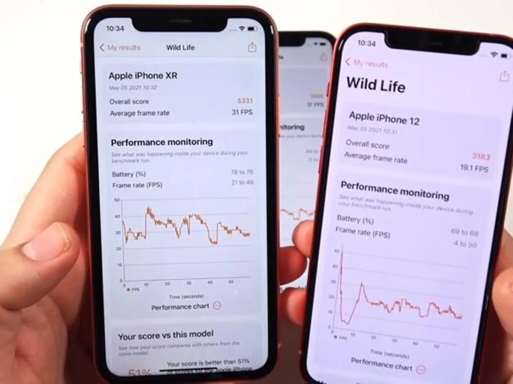 I en simuleret 'worst-case scenario' test, hvor skærmen konstant er tændt ved 200 nits lysstyrke og kører CPU- og GPU-intensive tests uafbrudt, holdt iPhone XR 19 minutter længere end iPhone XS Max og mere end en time længere end iPhone XS. Dette er et utroligt resultat, især da testen er designet til at dræne batteriet hurtigt og giver et konsistent sammenligningsgrundlag mellem enheder.