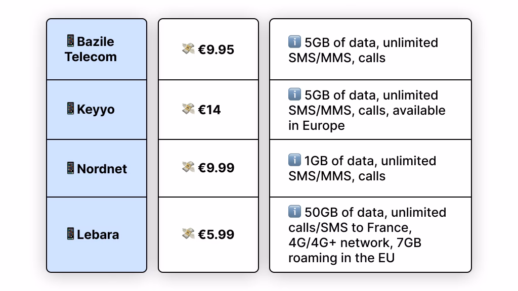 | Red by SFR | Fiber / DSL | Konkurrencedygtige priser, fleksible planer uden lange kontrakter, omfattende netværksdækning, flersproget support. | Kontraktvilkår og tvistløsning kan være vanskelig uden fransk kundskab. |