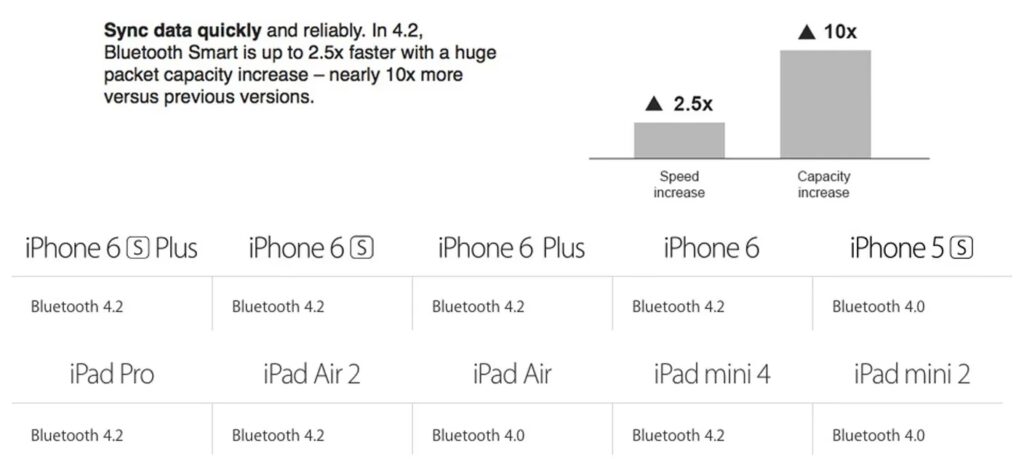 Ifølge Apples egne specifikationer blev iPhone 6, iPhone 6 Plus og iPad Air 2 opdateret til at understøtte Bluetooth 4.2. Dette skete sandsynligvis via en software- eller firmwareopdatering for nogle enheder, mens nyere producerede enheder muligvis kom med den nødvendige hardware fra starten. Ældre modeller som den originale iPad Air, iPad mini 2 og iPhone 5s forbliver på Bluetooth 4.0. Det er vigtigt at tjekke de officielle specifikationer for din specifikke enhed.