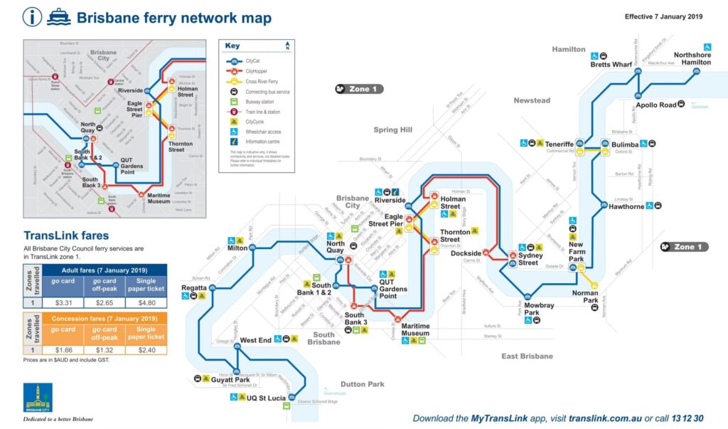 CityCats sejler på Brisbane River fra UQ St Lucia hele vejen til den familievenlige Northshore, Hamilton. Bemærk venligst, at mens CityCats stopper ved de fleste af nedenstående terminaler, betjener Cross River-færgen kun de indre bystop fra North Quay til Sydney Street i New Farm. De fire Cross River-færgeruter, der drives af KittyCat-færgerne, inkluderer: Bulimba – Teneriffe, Dockside – Sydney Street, Holman Street – Riverside, Maritime Museum – QUT Gardens Point. For mere detaljeret information henvises til Translink-køreplanerne inden afgang.
