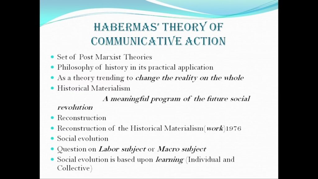 Habermas' teori om kommunikativ handling (1984) markerer et skift i analysen af moderne samfund. Som en del af den anden generation af Kritisk Teori, kritiserer Habermas Marx' produktionscentrerede sociale analyse og udvikler en ny model, der centrerer sig om kommunikativ rationalitet og kommunikativ handling. Hans tilgang er en syntese af Webers kritik af instrumental rationalitet, Parsons' systemteori og Marx' historiske materialisme.