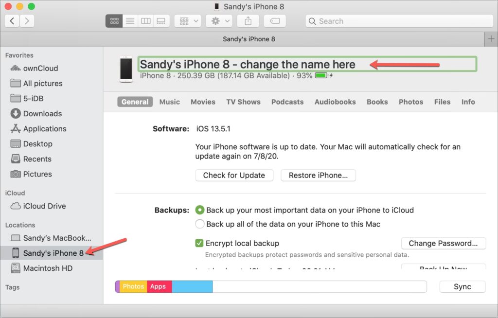 Med introduktionen af macOS Catalina blev iTunes opdelt i separate apps, og Finder overtog ansvaret for enhedshåndtering. Hvis din Mac kører macOS Catalina, Big Sur, Monterey, Ventura eller en nyere version, vil du bruge Finder til at omdøbe din iPhone.