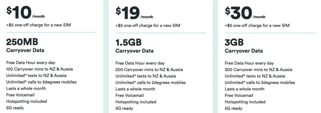 | 25 NZD Plan | 25 NZD | 3GB rollover | 250 rollover min. | Ubegrænset | Daglig gratis time data, 7.5GB gratis rollover data ved tilmelding, hotspotting |