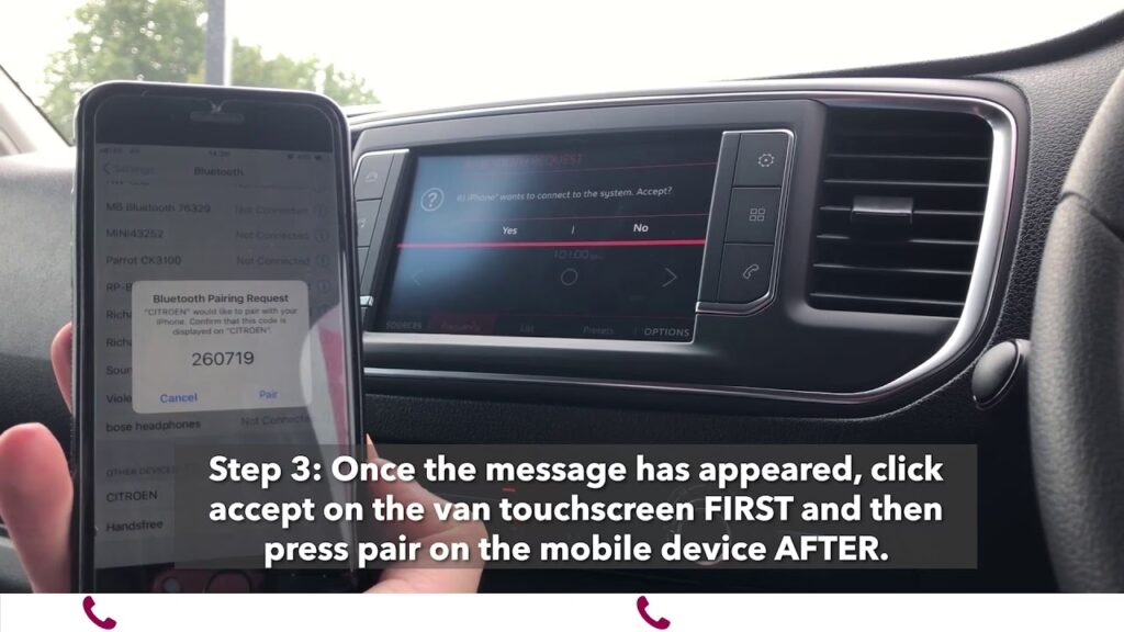 - Vælg din telefon: Din mobiltelefons navn bør dukke op på bilens display. Vælg den for at starte parringsprocessen.