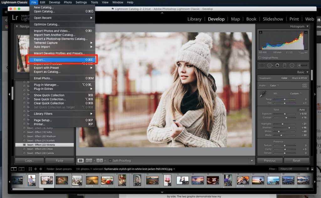 - Filnavngivning: En yderst fleksibel sektion, der giver dig mulighed for at navngive dit foto ved eksport. Du kan bruge et brugerdefineret filnavn eller en navngivningsforudindstilling, hvilket giver dig næsten uendelige muligheder for at skabe nye, organiserede navne.
