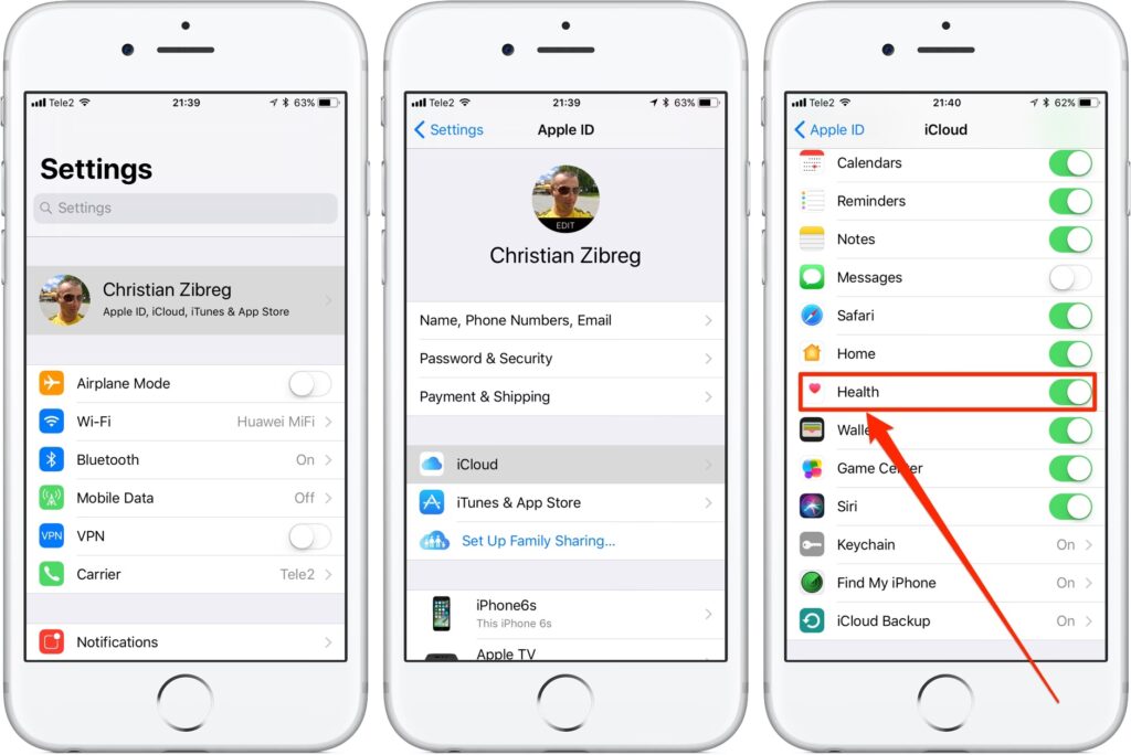 - Deaktiver iCloud Sundhedssynkronisering: Når iPhone 8 er gendannet, og alle de historiske data er til stede, skal du sørge for, at iCloud Sundhedssynkronisering er deaktiveret på denne enhed (Indstillinger > [Dit Navn] > iCloud > Sundhed: slå fra). Dette er afgørende for at forhindre, at iCloud overskriver disse data, før du får eksporteret dem.