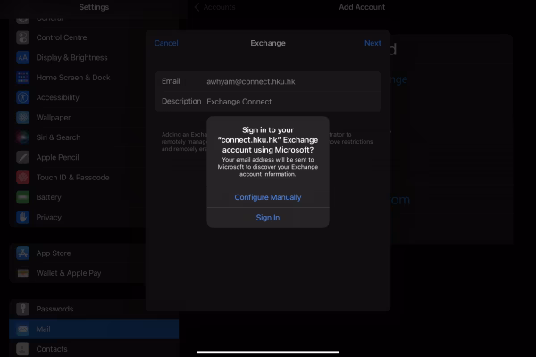 - Vælg den korrekte kontotype. For de fleste universitetskonti vil dette være Exchange eller Microsoft 365. Hvis du er usikker, kan du kontakte KU's IT-support for at få de korrekte serverindstillinger.