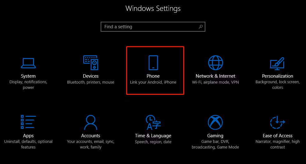 - På din Windows 10 PC: Gå til Startmenuen > Indstillinger > Telefon.