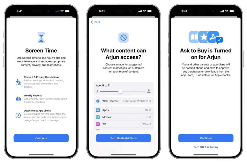 Når barnets konto er oprettet og indstillingerne er justeret, kan du logge ind på den på deres iPhone, iPad eller Mac.