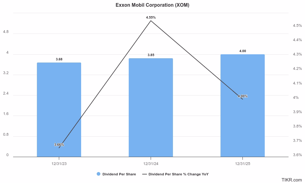 Det årlige udbytte per aktie for Exxon Mobil (XOM) i 2023 var $3,68.