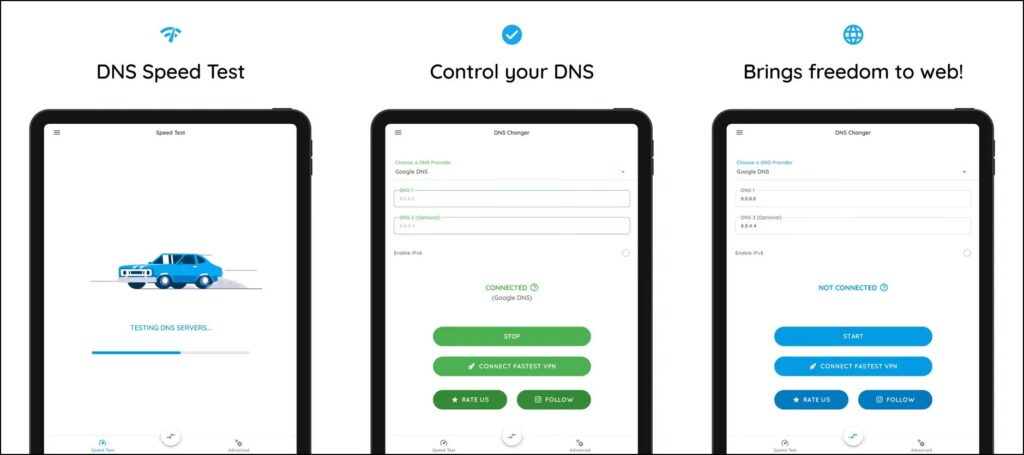 Mange apps markedsfører sig under navnet 'DNS Changer'. Disse apps lover den nemmeste måde at ændre din DNS på og fungerer typisk for både Wi-Fi og mobilnetværksdataforbindelser. En vigtig pointe, de fremhæver, er, at de ændrer din enheds DNS-adresse uden at påvirke din forbindelseshastighed negativt. De er ofte hurtigere end en traditionel VPN, da de kun omdirigerer DNS-forespørgsler og ikke al din netværkstrafik. Mange af disse apps inkluderer også en funktion, der kan finde den hurtigste DNS-server for dig med et enkelt tryk, hvilket potentielt kan forbedre din browsing- og spiloplevelse (ping og latenstid).