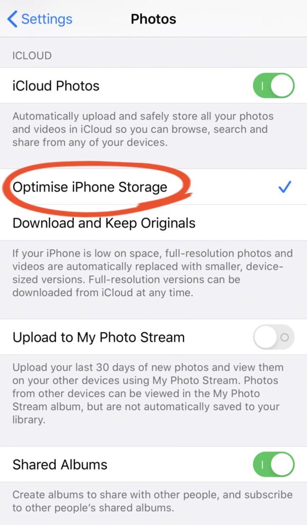 - Pladsbesparelse på enheden: Ved at vælge indstillingen 'Optimer iPhone-lagring' kan du frigøre plads på din iPhone. I stedet for at gemme fuldopløselige originaler på din enhed, gemmer den optimerede versioner, mens originalerne forbliver i iCloud. Når du har brug for en original, downloades den automatisk.