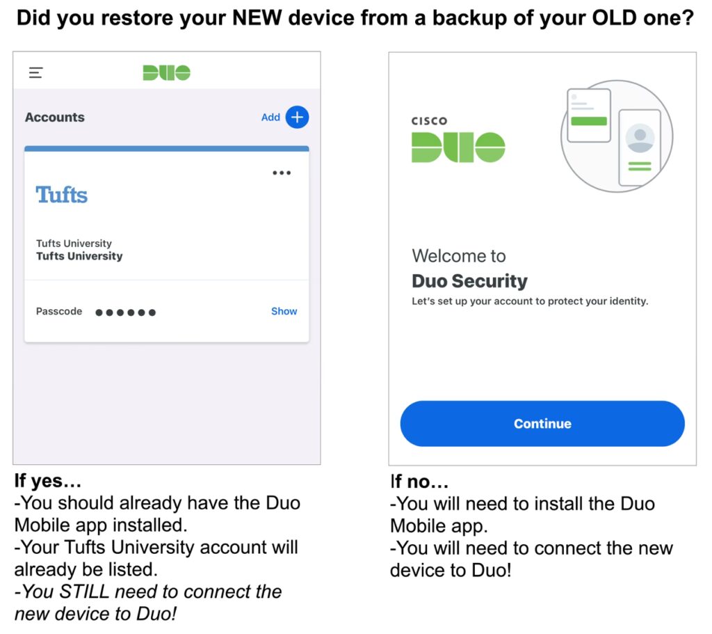- Gendan fra sikkerhedskopi: Åbn Duo Mobile-appen på din nye enhed og følg vejledningen for at gendanne din konto. Du vil sandsynligvis blive bedt om at logge ind på din Duo-konto.