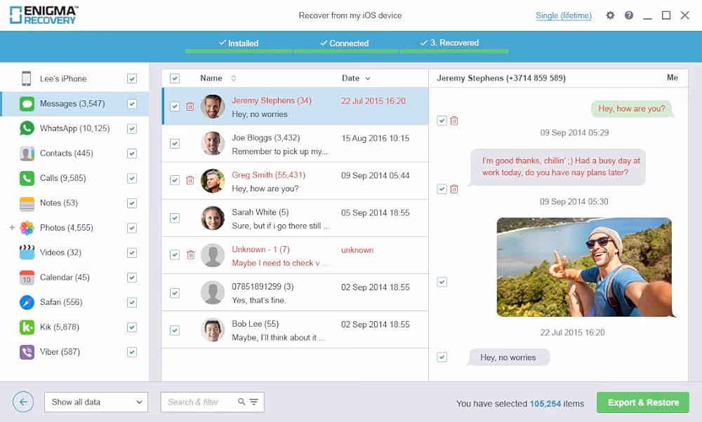 Enigma Recovery understøtter gendannelse af et bredt udvalg af filtyper, herunder tekstbeskeder (SMS, iMessages), kontakter, opkaldshistorik, noter, WhatsApp, fotos, videoer, internet-historik, kalenderbegivenheder, Kik og Viber-beskeder.