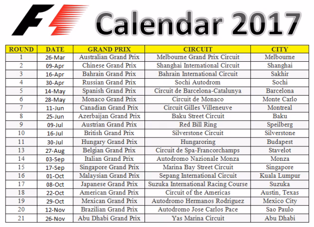 Den første foreløbige udgave af Formel 1-kalenderen for 2017 blev offentliggjort af FIA den 28. september 2016. En revideret og endelig version af kalenderen, der inkluderede justeringer som f.eks. ombytning af løbsdatoer for Malaysia og Singapore samt flytningen af Baku, blev frigivet den 30. november 2016.