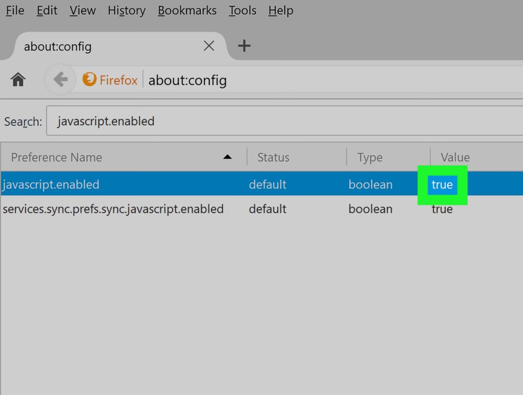 javascript.enabled. - Kontroller værdien ud for denne præference. Hvis den er