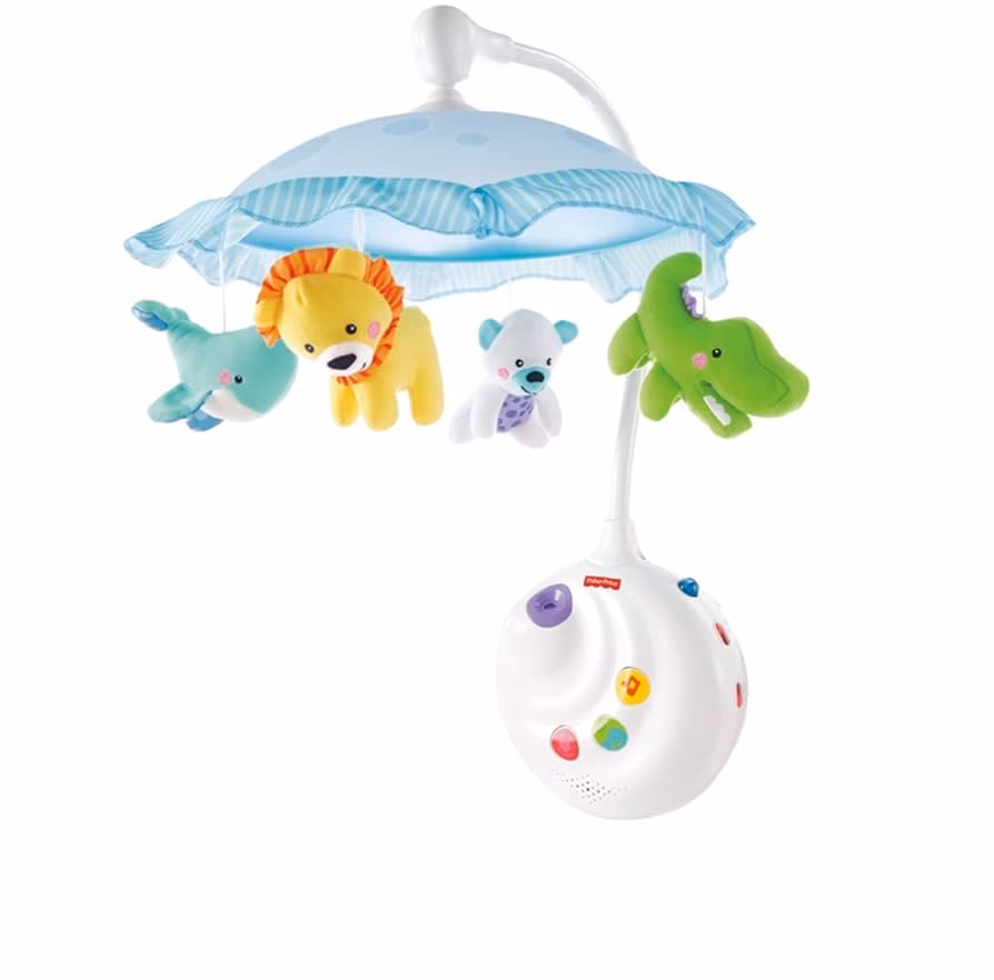 Fisher-Price Precious Planet 2-i-1 Projektionsmobil er mere end blot en vuggeuro; det er en investering i din babys tidlige udvikling og dit eget ro i sindet. Med sin innovative projektion på baldakin og loft, et rigt udvalg af lydlandskaber og den praktiske fjernbetjening, tilbyder den en komplet sanseoplevelse, der både underholder og beroliger de mindste. Dens 2-i-1-funktion sikrer, at den forbliver en værdifuld del af børneværelset, længe efter at din baby er vokset ud af vuggen. Denne mobil er et bevis på Fisher-Prices engagement i at skabe sikre, sjove og udviklingsmæssigt passende legetøj, der glæder børn og hjælper forældre verden over.
