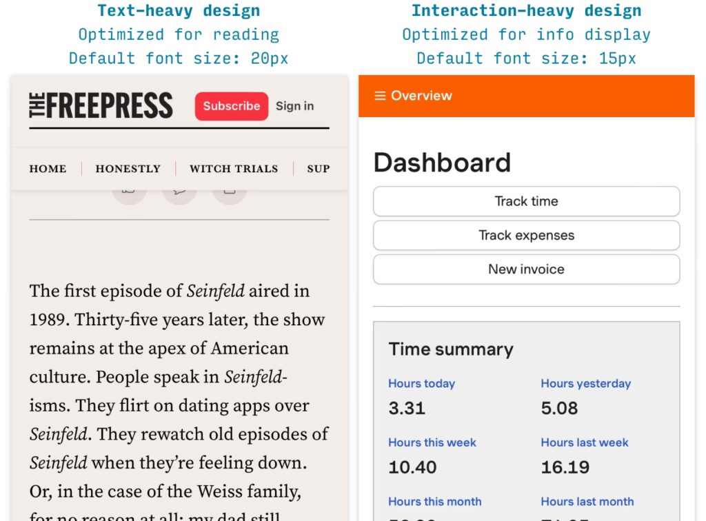 Lister er et almindeligt element på mobile sider. Standardlisteelementer er ofte 16px, men tættere lister, som dem i sidepaneler, kan være 14px, eventuelt med en federe vægt for at kompensere. Det er også værd at bemærke, at forskellige operativsystemer (OS) har deres egne typografiske retningslinjer, som det kan være nyttigt at kende til, især hvis du designer apps. Androids Material Design anbefaler for eksempel 16sp (scalable pixels) for standard brødtekst og listeelementer, og 20sp for titler. iOS's retningslinjer for SF Pro-skrifttypen angiver 17px som standard for brødtekst og 15px for sekundær tekst. Selvom disse er specifikke for apps, giver de en god indikation af, hvad brugerne forventer af læsbarhed på mobile enheder.