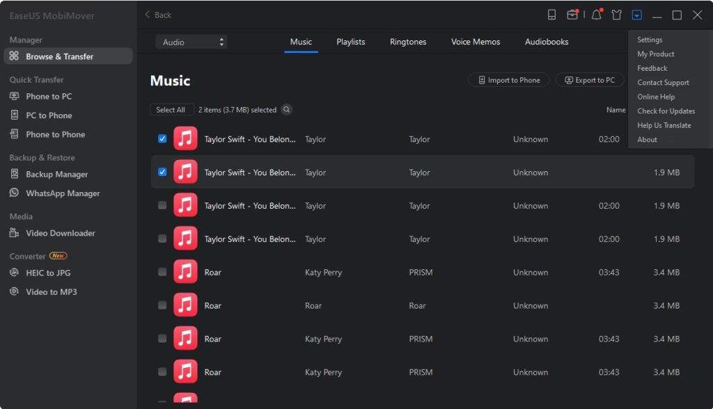 - Hvad hvis jeg har brug for at overføre podcasts eller lydbøger?AOMEI FoneBackup fokuserer primært på musikfiler, men dens evne til at overføre forskellige filtyper kan udvides til andre lydformater. Det er altid en god idé at tjekke softwarens specifikke understøttelse.