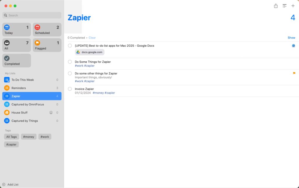 Den bedste to-do liste er den, du har med dig, ikke sandt? Hvis du ejer en Mac eller iPhone, har du allerede Påmindelser, som følger gratis med hver Apple-enhed. Apples standardapp til opgavestyring er enkel, men i de seneste år er den blevet relativt kraftfuld. Du kan oprette lister over opgaver, tilføje tags, forfaldsdatoer og underopgaver, automatisk organisere ting ved hjælp af smarte lister, og endda tilføje alarmer, der udløses, når du ankommer til eller forlader en bestemt placering. Du kan også lave indkøbslister, der automatisk sorterer produkter i de rigtige kategorier. Der er ingen universel tastaturgenvej til at tilføje opgaver, men der er integration med Siri for Mac, hvilket er noget ingen anden app på denne liste kan hævde uden en hacky workaround. iCloud-integration betyder, at du meget nemt kan synkronisere opgaver med din iPhone og iPad, samt dele lister med venner og familiemedlemmer – og endda tildele dem opgaver. Hvis du har hundredvis af to-do's at holde styr på, kan Påmindelser blive rodet, men hvis du bare har brug for en app til at holde styr på de ting, du skal købe næste gang du er i supermarkedet, er Påmindelser en god mulighed, der følger gratis med din Mac/iPhone.