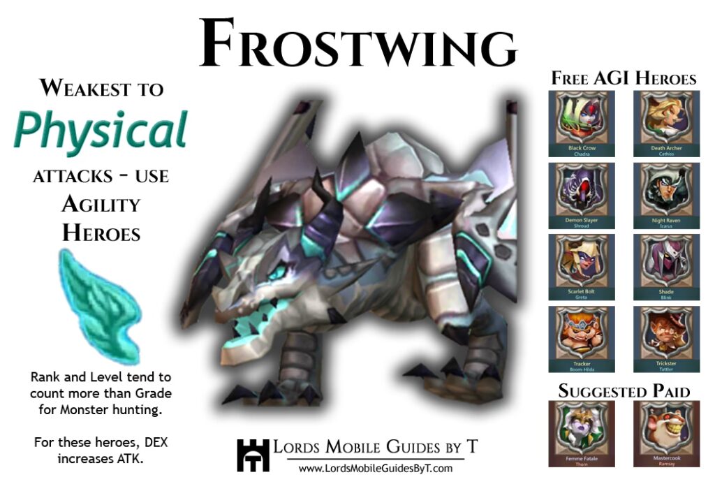 På grund af Frostwings høje forsvarsstatistikker anbefales en strategi baseret på AGI (Agility). Hurtige helte med undvigelsesevner kan påføre mere skade i det korte tidsvindue, du har til at angribe monsteret.