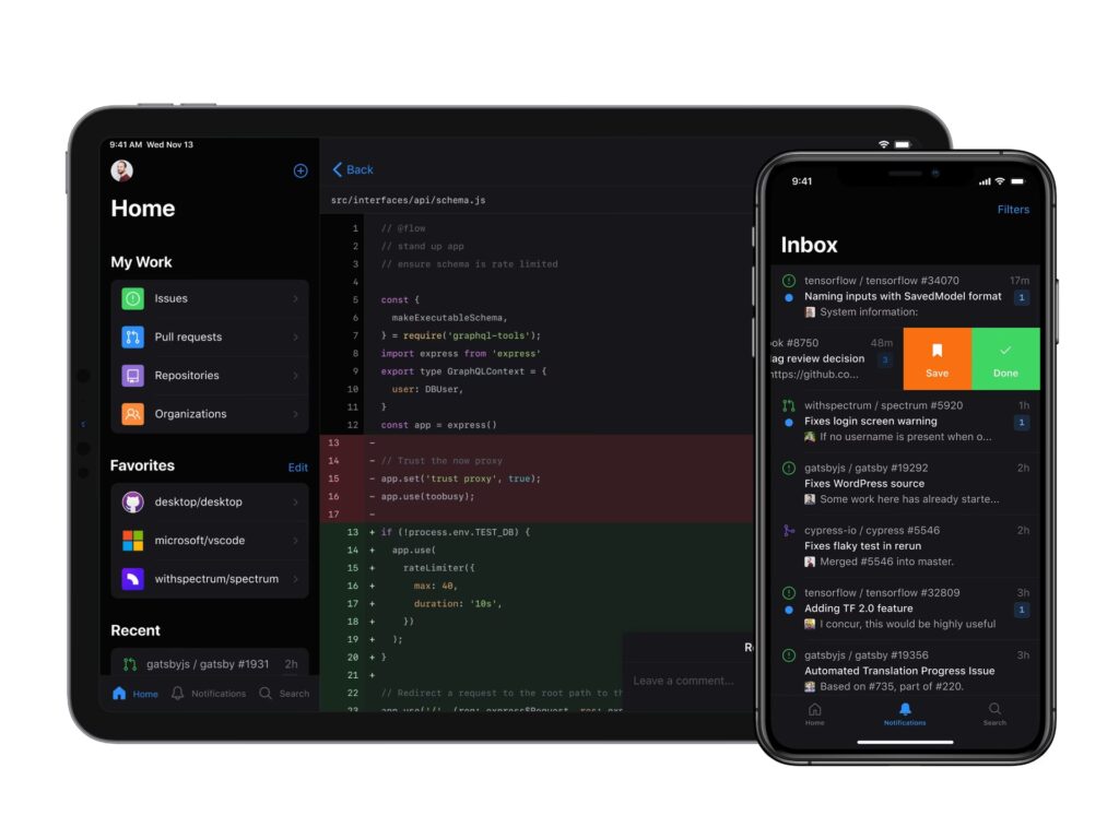 - Gennemgang af Issues og Pull Requests: Læs, gennemgå og samarbejd om issues og pull requests direkte fra din enhed. Dette inkluderer muligheden for at redigere filer i pull requests, hvilket er en game-changer for hurtige rettelser og feedback.