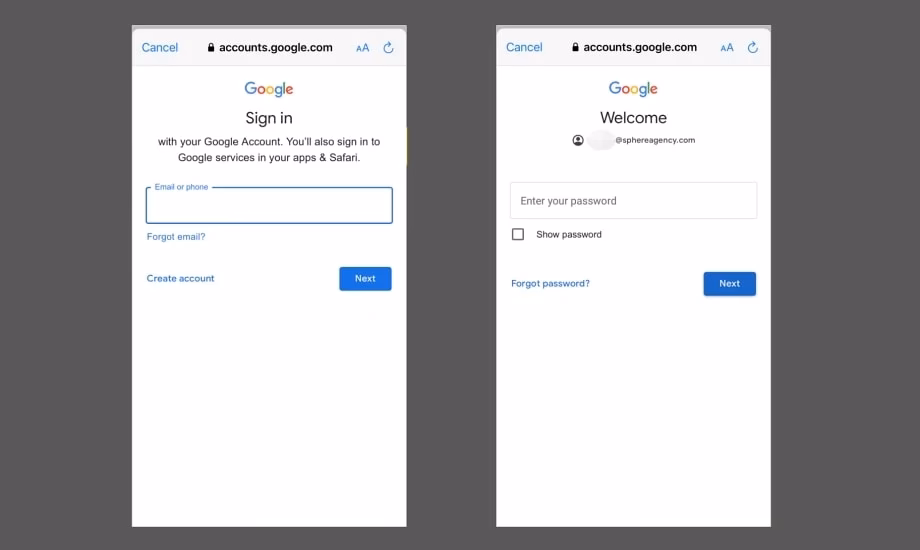 - iOS: Hvis du bruger en browser, bliver du bedt om at logge ind via Gmail-appen, eller du kan fortsætte i browseren.