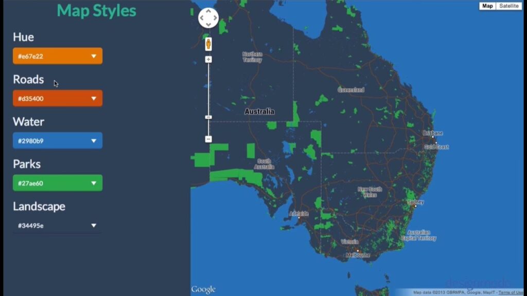mapTypeIdfor at tilbyde brugere forskellige visninger af kortet, afhængigt af deres behov. Et terrænkort kan være ideelt til vandreture, mens satellitbilleder giver et realistisk overblik. - Tilpasning: Google Maps API giver dig mulighed for at tilpasse kortets udseende ved at ændre stilarter. Dette kan være nyttigt for at tilpasse kortet til din applikations design eller for at fremhæve specifikke funktioner. Du kan fjerne POI'er (Points of Interest), ændre farver på veje og meget mere.