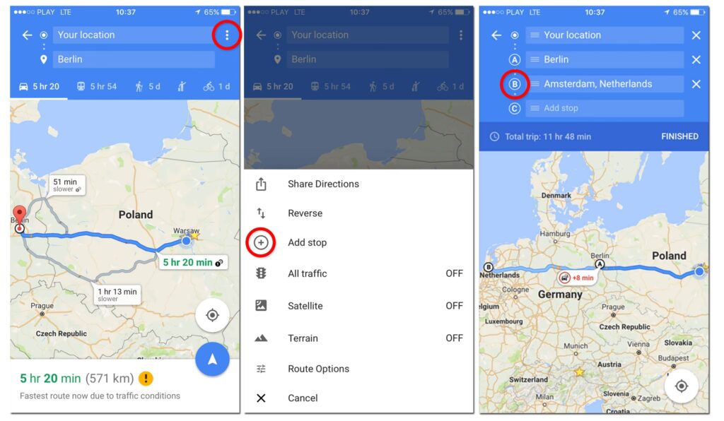 - Når du har tilføjet alle dine destinationer, skal du trykke på ikonet med de tre prikker i øverste højre hjørne.