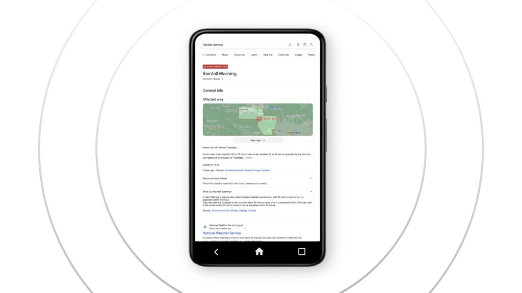Når en bruger søger efter noget, der er relevant for en aktiv alarm – for eksempel "vejrudsigt" eller "vejr advarsel" i et specifikt område – vil Google Search vise en fremtrædende advarsel. Denne advarsel indeholder typisk en beskrivelse af hændelsen, det berørte geografiske område, den tidsmæssige gyldighed samt potentielle handlinger, som brugeren bør overveje. For at se en alarm, der ikke direkte relaterer sig til din aktuelle placering, kan det være nødvendigt med en mere specifik søgning.