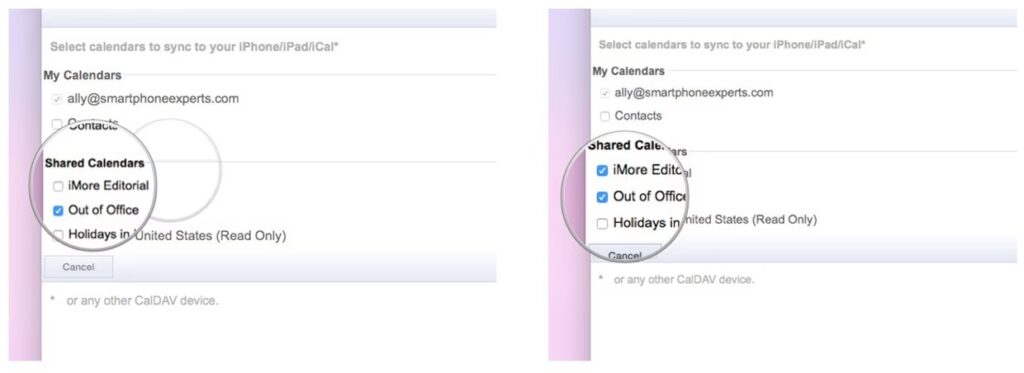 - Under sektionen "Shared Calendars" (Delte Kalendere), skal du sætte et flueben ud for de kalendere, du ønsker at se på dine Apple-enheder.