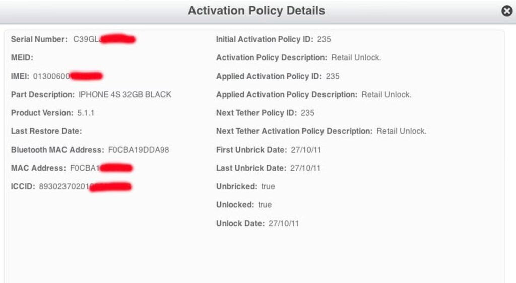 - De mest essentielle oplysninger, der næsten altid er til stede, er data om den oprindelige aktiveringspolitik, enhedens bindingspolitik ('Next Tether Policy Description') og den aktuelle låsestatus ('Unlock Date: Unlocked:'). Andre detaljer som garantistatus eller købsdato er yderligere og kan variere mellem forskellige udbydere af GSX tjek.