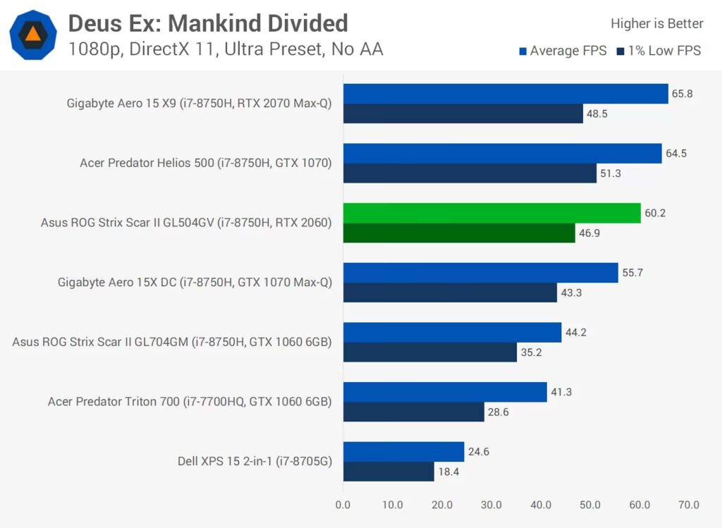 Sammenlignet med GTX 1060 Mobile er forskellen mere markant. GTX 1060 Mobile er generelt 60% hurtigere end GTX 1050 Ti. I praksis betyder det, at mens GTX 1060 Mobile kan håndtere mere krævende titler ved højere indstillinger eller med højere billedhastigheder, vil GTX 1050 Ti Max-Q være bedst egnet til at køre spil på medium til høje indstillinger ved 1080p.