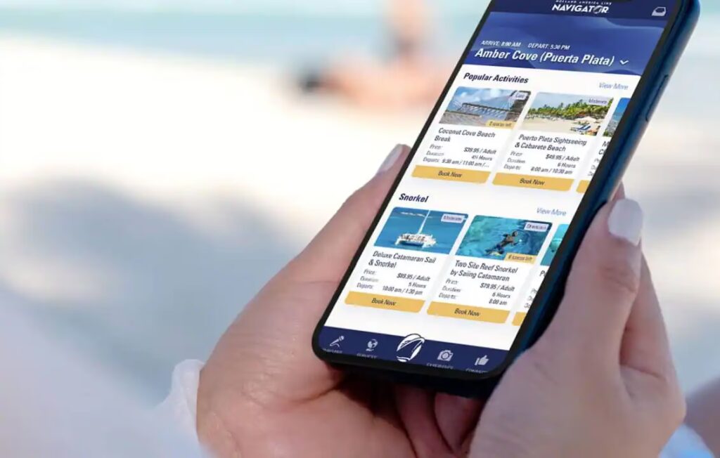 Navigator giver dig også mulighed for at udvælge og gemme aktiviteter, så du kan personliggøre din daglige tidsplan. Disse aktiviteter vises sammen med dine bookede middagsreservationer og udflugter, hvilket holder alt organiseret og let tilgængeligt ét sted. Du kan endda sætte notifikationer op for at modtage påmindelser og alarmer for reservationer, beskeder og meget mere.