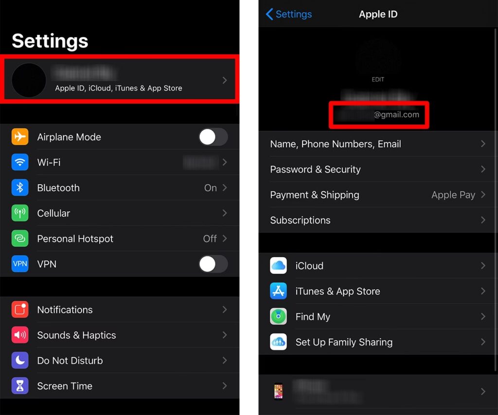 - Under dit navn, øverst på den næste skærm, vil du se dit Apple ID angivet. Det er typisk en e-mailadresse.