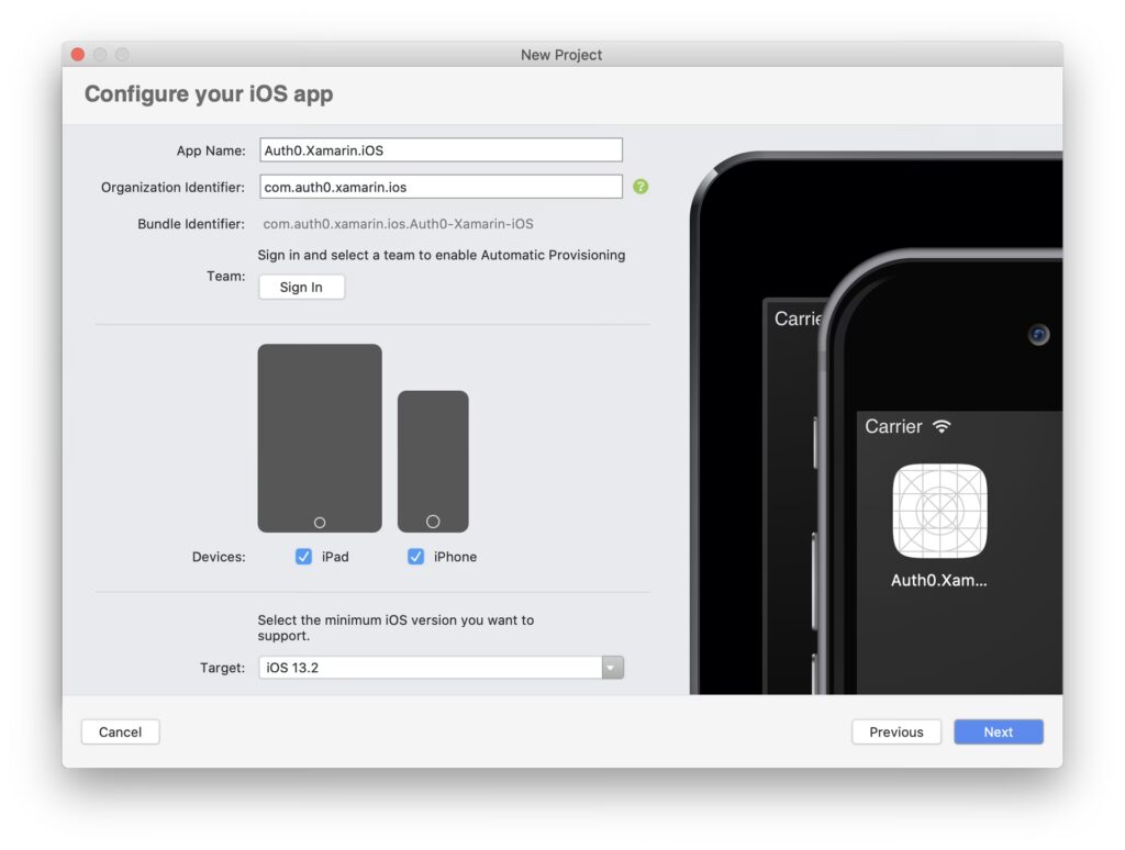Nu hvor din Xcode-opsætning er på plads, skal du justere dit Xamarin.iOS-projekt, så det matcher. Den vigtigste del er at sikre, at Bundle Identifier i dit Xamarin-projekt er identisk med det, du brugte i dit Xcode-testprojekt.