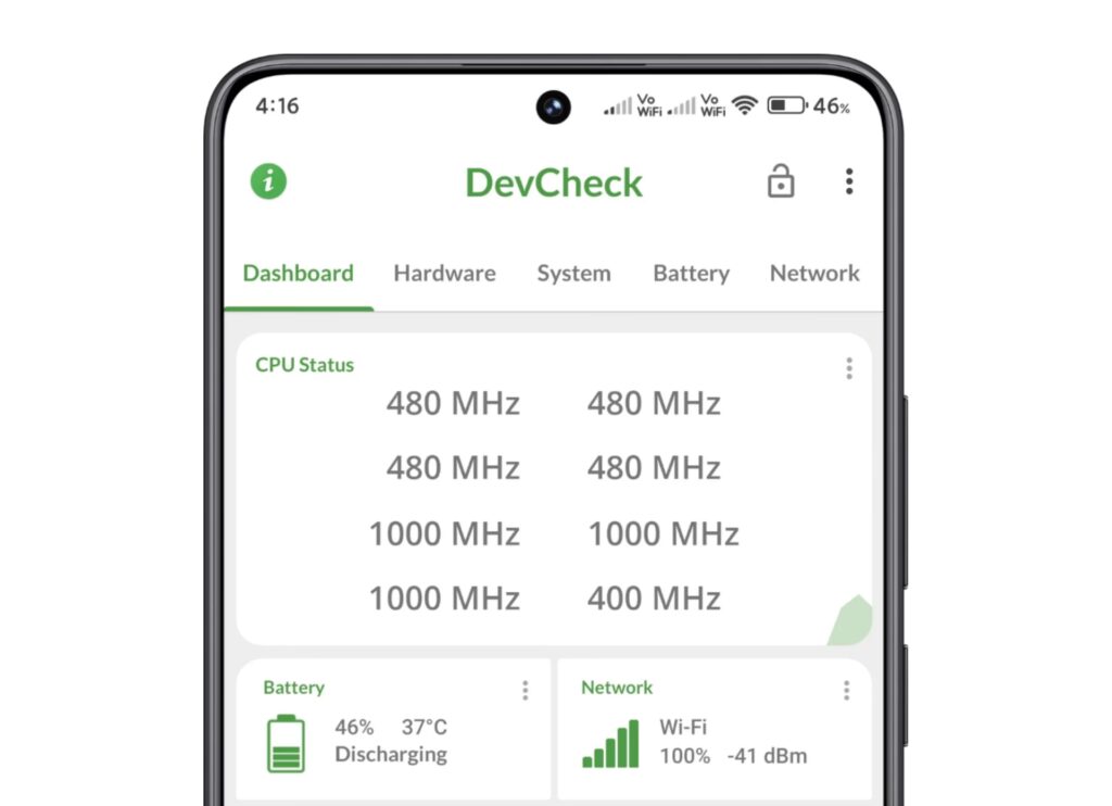 Inware er en nyere, men enkel app med en ren brugerflade. Du skal blot installere appen og åbne den. Tryk på fanen "Hardware" for at tjekke din telefons processor og dens type. Appen er let at navigere i og giver hurtigt et overblik.