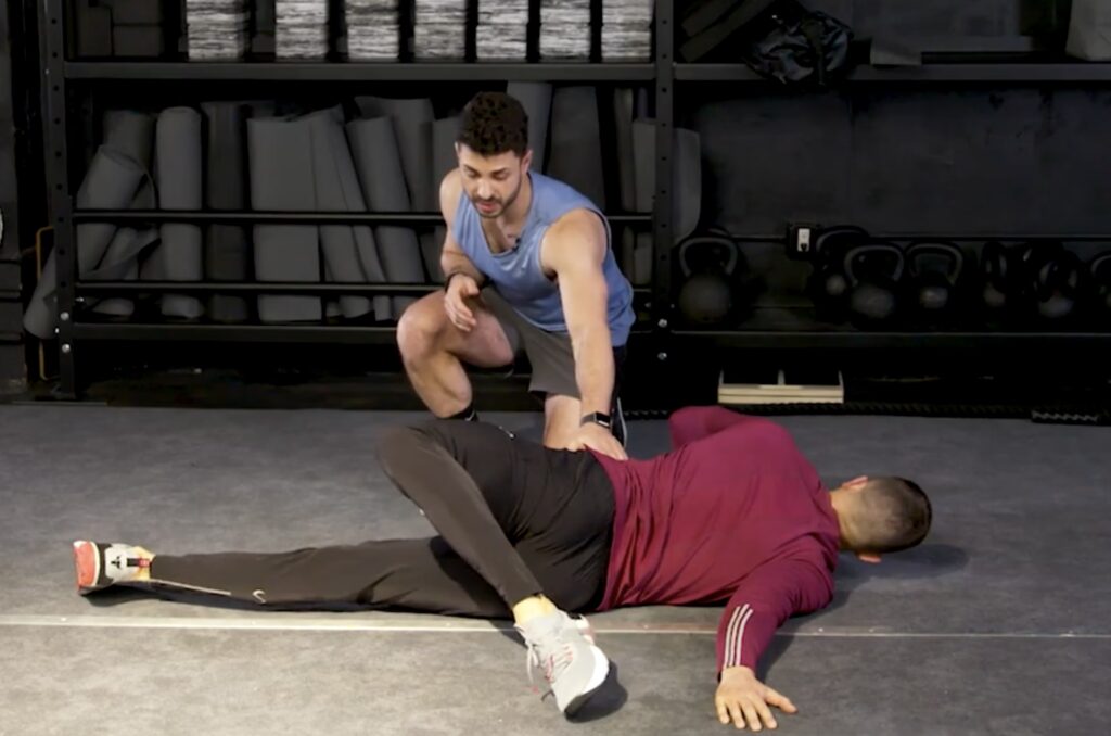 Den første bevægelse i vores flow er denne simple strækøvelse på gulvet, som du udfører liggende på ryggen. Sigt efter 10 gentagelser med 5-sekunders hold på hver side. Giordano bemærker: "Første gang du laver disse, får du ikke meget bevægelse, men jo mere konsekvent du er, jo mere bevægelse får du over tid, og din krop vil bedre forstå denne bevægelse."