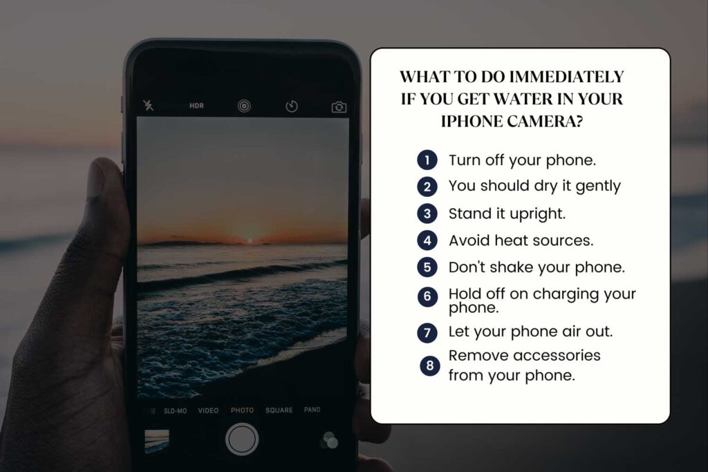 Place your phone in a bowl of dry rice or silica gel, ensuring it’s fully submerged. Leave it untouched for at least 24 hours to allow these moisture-absorbing agents to dry out the camera. How do I dry my iPhone? Power off your iPhone, pat it dry with a soft cloth, and place it in a bowl of dry rice or silica gel for at least 24 hours.