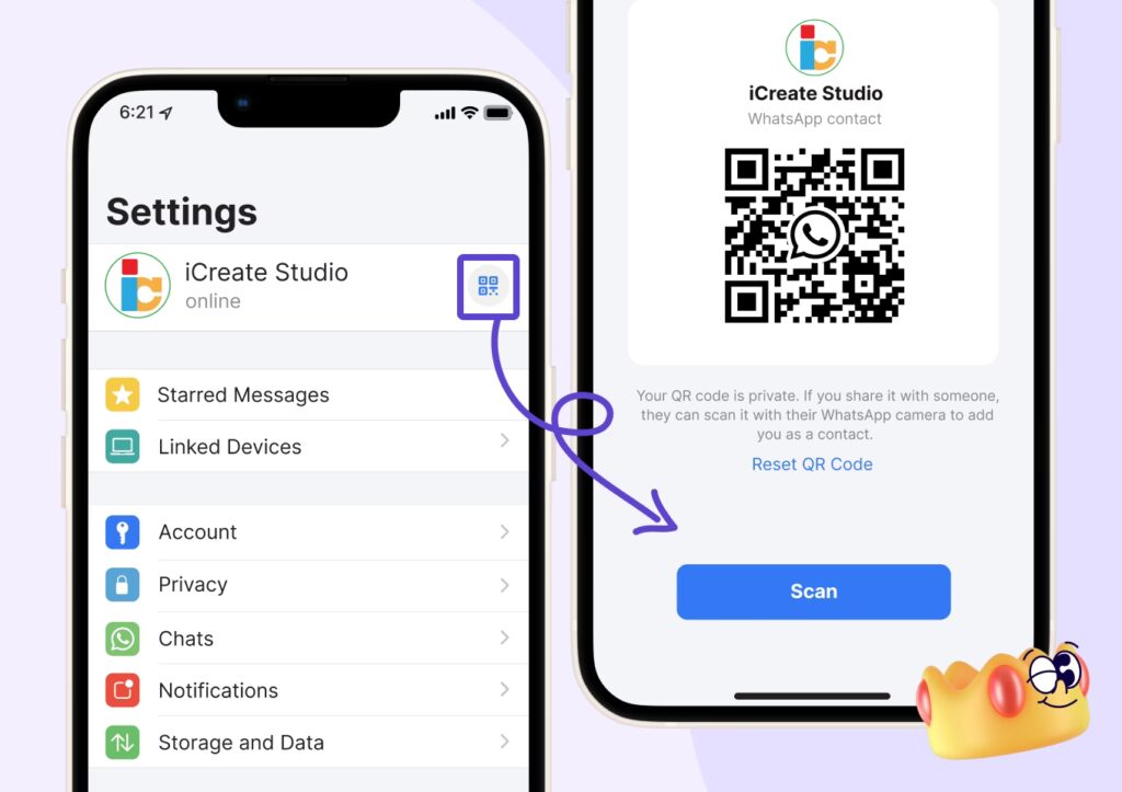 - Tilføj kontakter via QR-kode: For at tilføje en kontakt via deres QR-kode, skal du gå til Indstillinger > tryk på din profil-QR-kode øverst. Her kan andre scanne din kode. For at scanne en andens kode, tryk på "Scan"-knappen nederst.